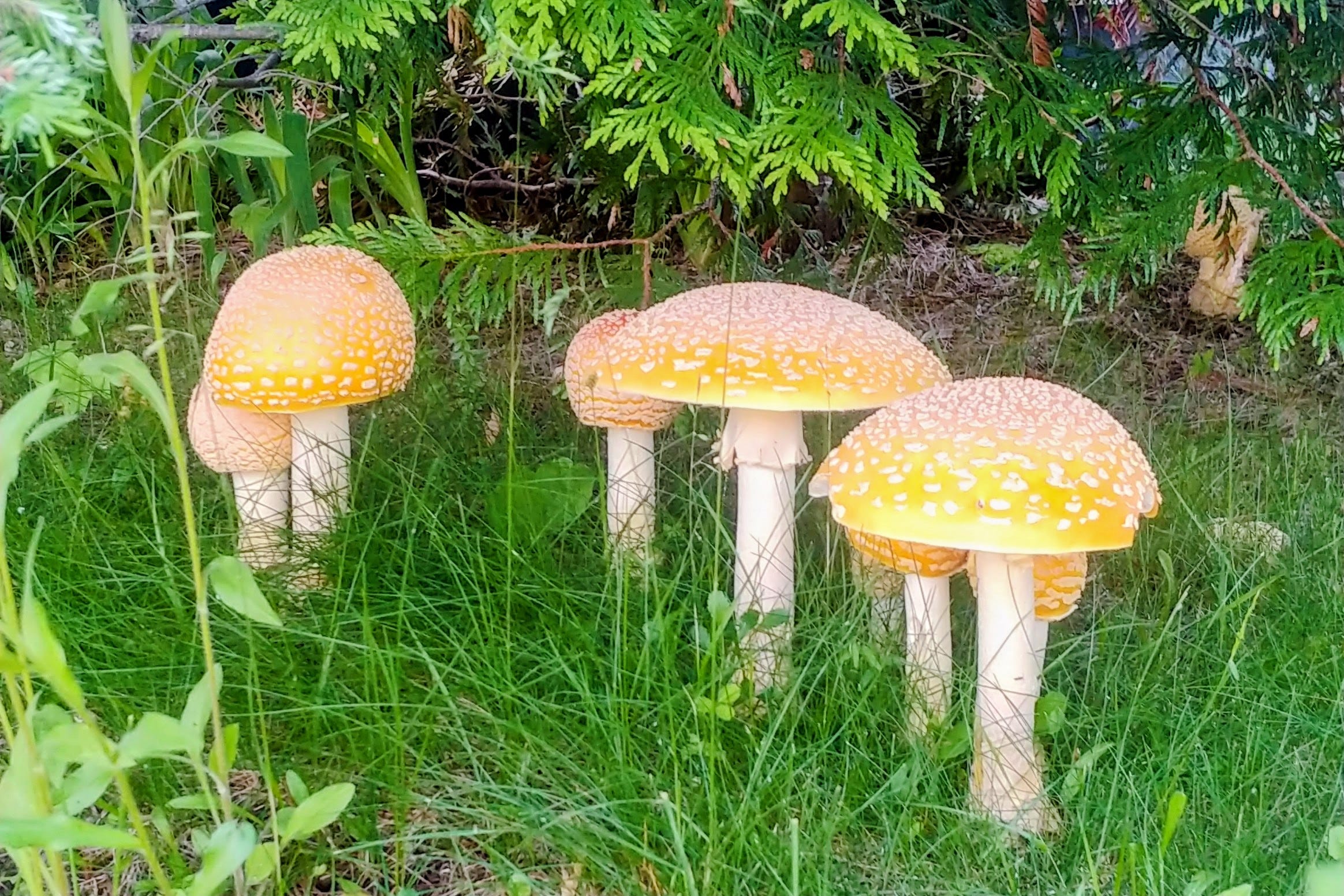 ( Some nice amanita muscaria var. guessowii under a cedar tree in Eastern Canada)